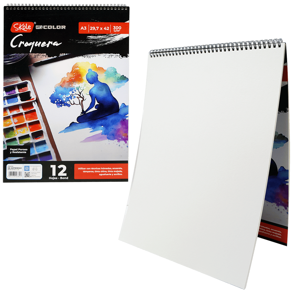 Croquera Skole A3 (29,7×42 cm) con 12 hojas de 300g, papel poroso de alta resistencia ideal para acuarela, témpera, tinta y acrílico. ✔ Papel grueso profesional ✔ Ideal para técnicas húmedas ✔ Alta demanda en arte ✔ Excelente presentación ✔ Producto premium para librerías artísticas Ideal para elevar el nivel de tu surtido.