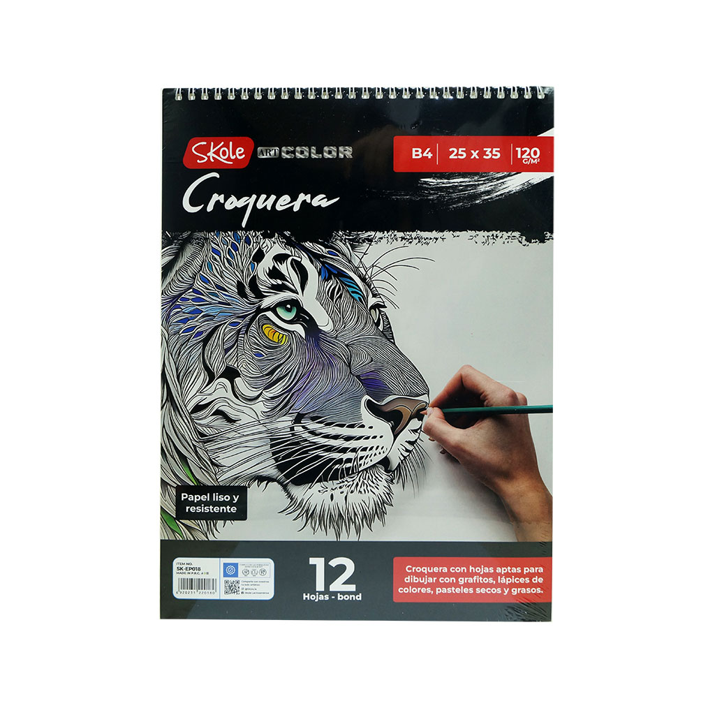 Croquera Skole tamaño B4 (25×35 cm) con 12 hojas de papel liso de 120g, ideal para grafito, lápices de colores y pasteles. ✔ Formato grande de alta demanda ✔ Papel resistente ✔ Ideal para estudiantes y artistas ✔ Producto de buena rotación ✔ Excelente para surtido artístico Perfecta para ampliar tu oferta de croqueras.
