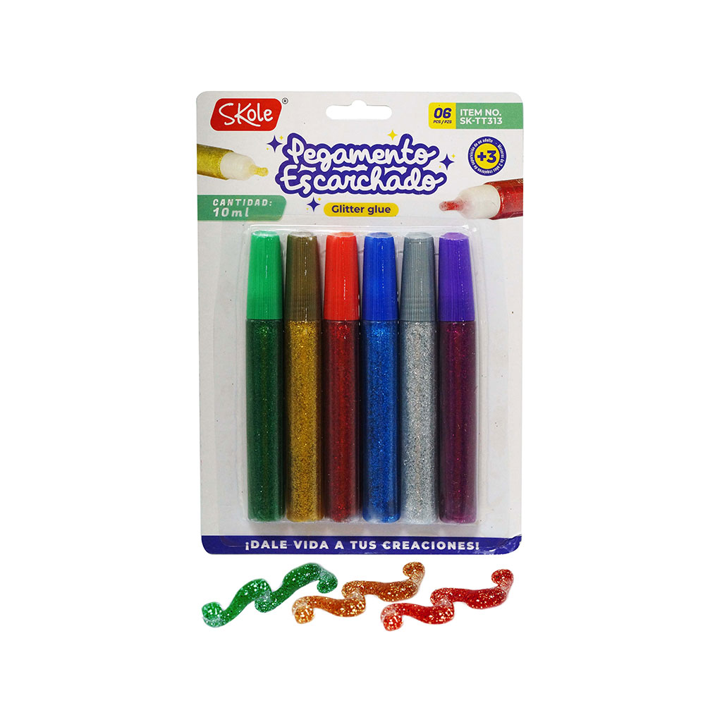 Pegamento con glitter, el set incluye 6 piezas con colores surtidos .