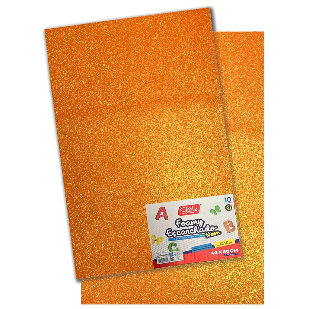 GOMA EVA NARANJA GLITTER PLIEGO 40CMx60CMx1.8MM (10PZAS)