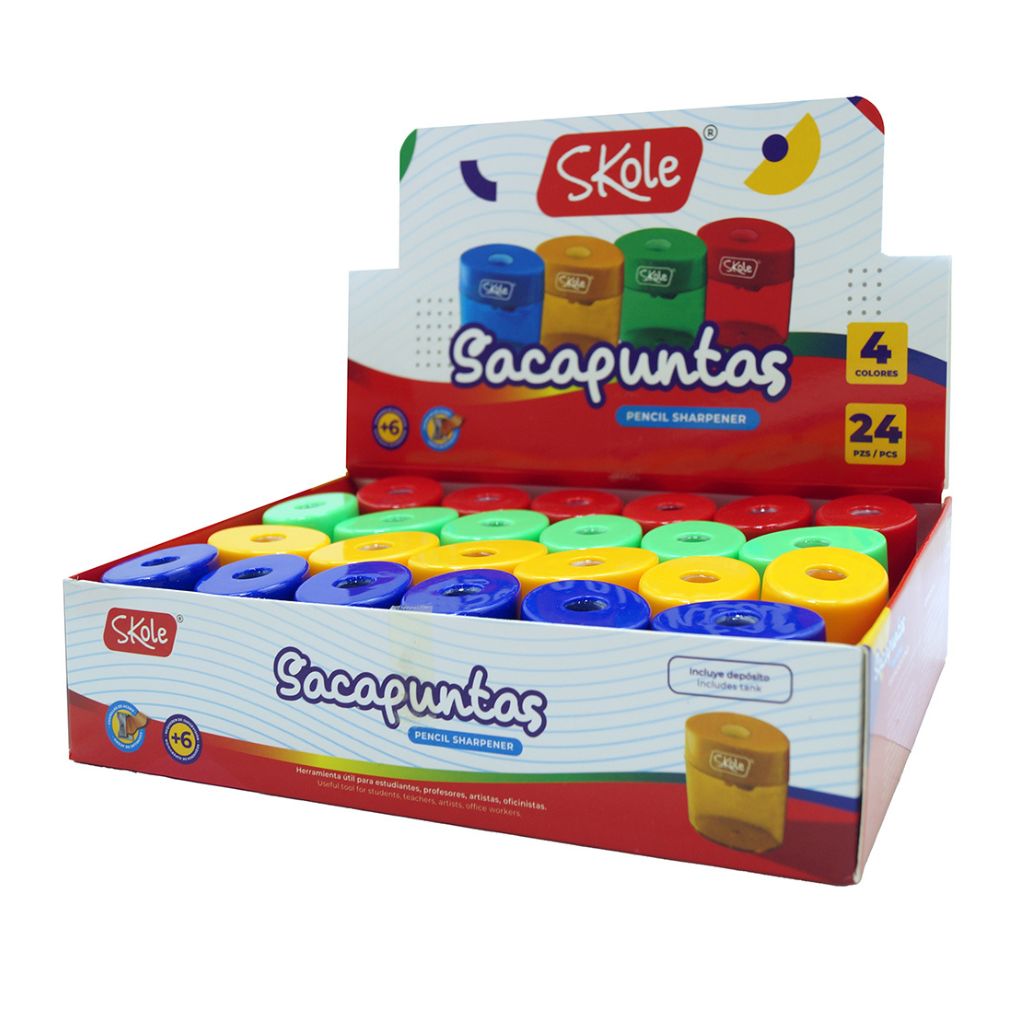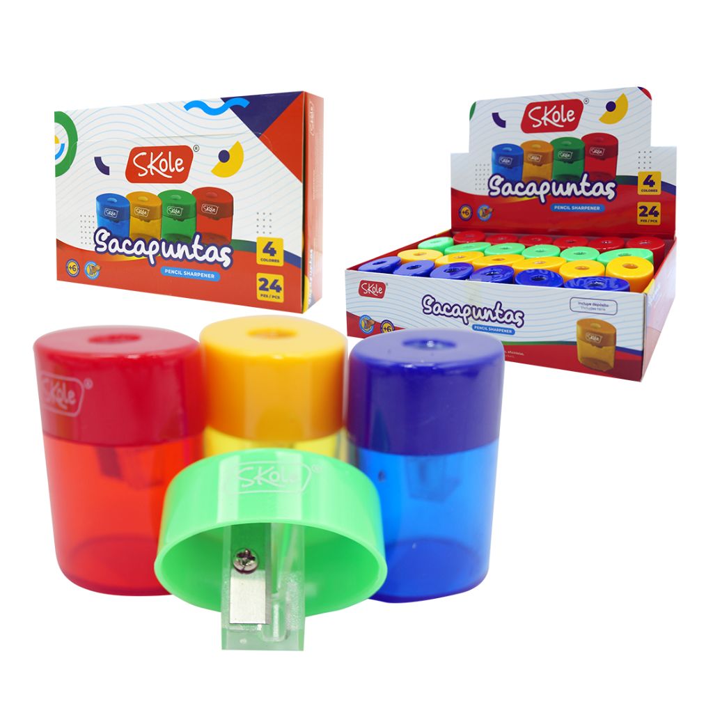 Box contiene 24 sacapuntas para lápiz tradicional, cuerpo de plástico. Surtido en 4 colores.